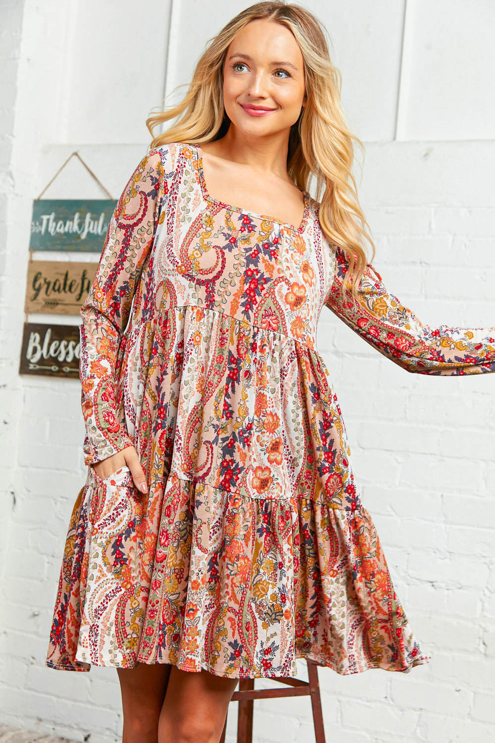 This eye catching floral print dress designed with a unique square neckline and side pockets is trendy and fun and perfect for the changing seasons. Pare with heels or boots.
