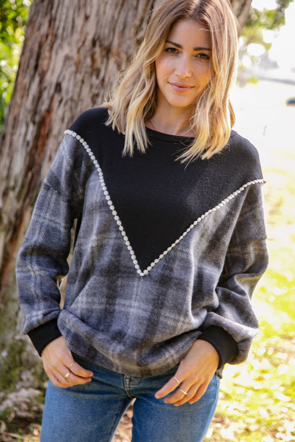 Expand your casual closet with this over sized brushed Hacci V yoke top featuring popular plaid and fun pom-pom details for added flair.
